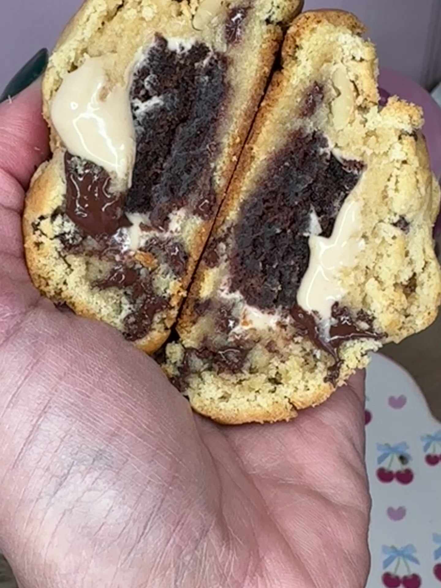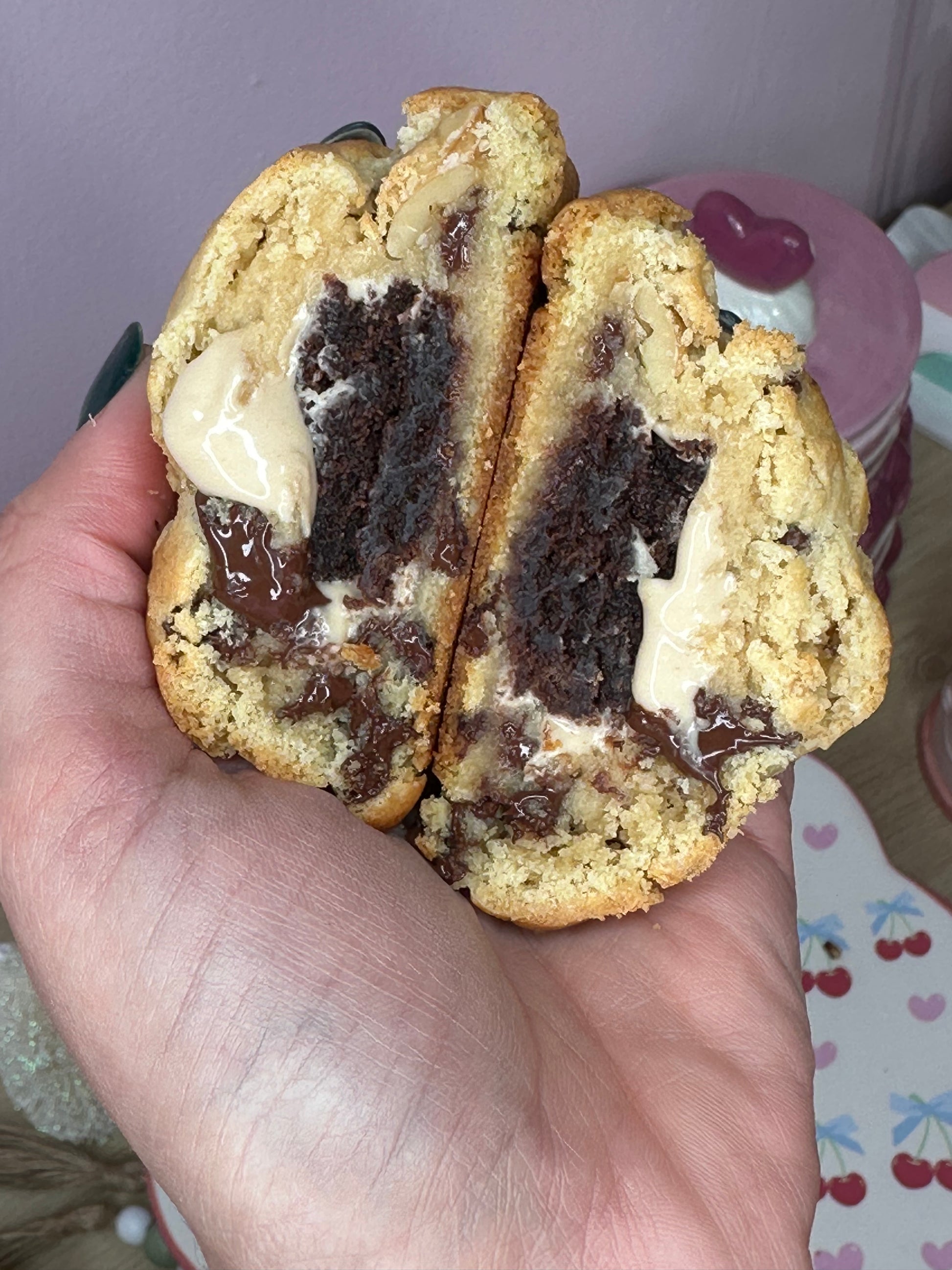 Galleta NY style de masa de vainilla, suave por dentro y ligeramente crujiente por fuera, con un relleno generoso de brownie y crema de avellanas que se derrite en cada bocado.